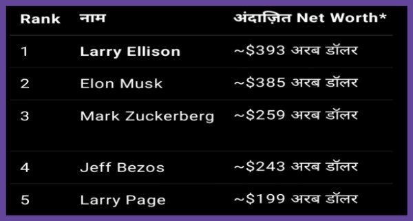 Net Worth की इस दौड़ में अब लैरी एलिसन सबसे ऊपर हैं। उनके बाद एलन मस्क और फिर जेफ बेजोस व बर्नार्ड अरनॉल्ट आते हैं। यह बदलाव दिखाता है कि टेक कंपनियों का प्रदर्शन अरबपतियों की लिस्ट पर सीधा असर डालता है।